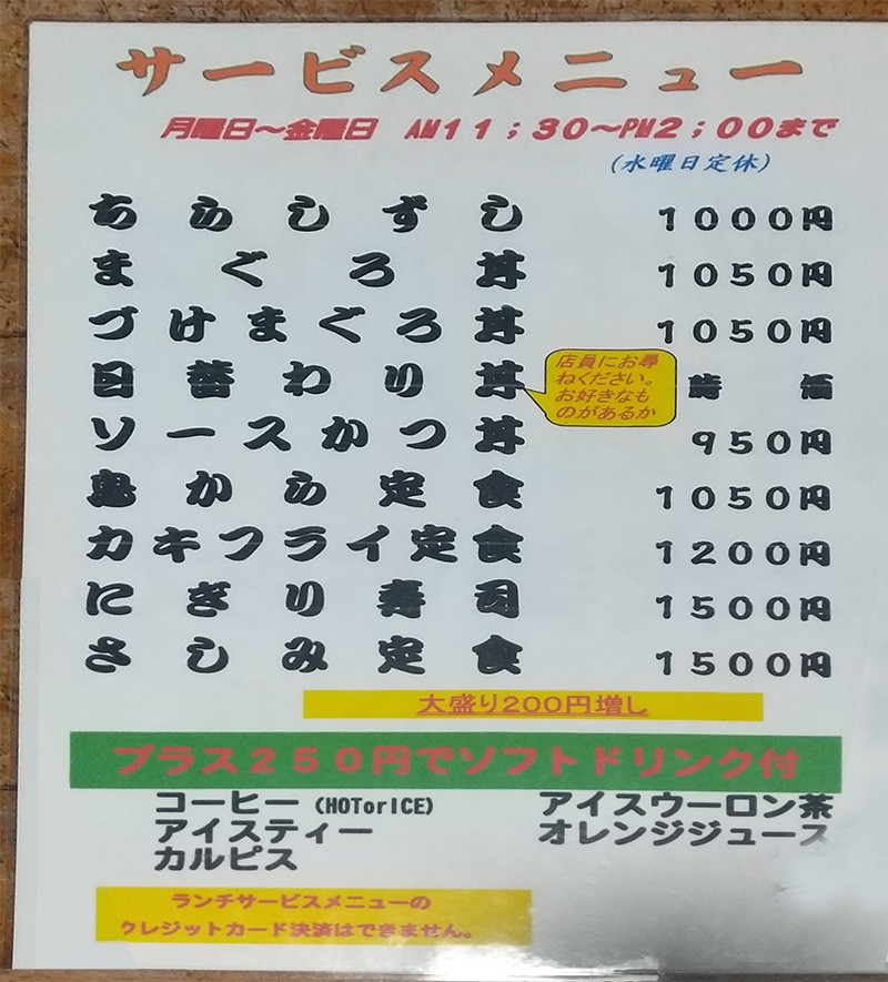 お寿司の他、揚げ物メニューもあります(ソースカツ、カキフライなど)