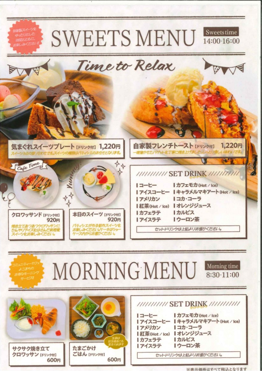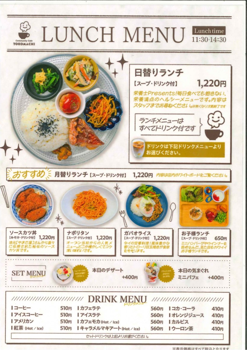 サービスやメニュー | ■ランチ メニュー(汁物・ドリンク付き)■ 日替わりランチ 1,220円 ソースカツ丼 1,220円 ナポリタン 1,220円 ガパオライス 1,220円 お子様ランチ 650円 月替わりランチ 1,220円 <セットメニュー> 本日のデザート プラス400円 本日の気まぐれミニパフェ プラス400円 ■モーニング メニュー(ドリンク付)■ サクサク焼き立てクロワッサン 600円 たまごかけごはん 600円 ■スイーツセット(ドリンク付)■ 気まぐれスイーツプレート 1,220円 自家製フレンチトースト 1,220円 クロワッサンド 920円 本日のスイーツ 920円 ■テイクアウト・デリバリーもあります♪■ メニュー詳細は公式サイト・SNSご覧ください♪ 各700円 大盛りプラス50円となります。 ※デリバリーは5食以上の場合3日前までにご予約お願いします。 ----------------------------------------------------- ※価格は変更になる場合があります。公式サイト・SNSでご確認ください。 事前の問い合わせでレンタルスペースとしてカフェを利用できます。ぜひお問合せください! |